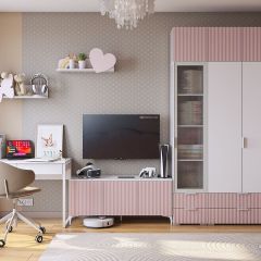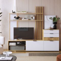 Состоит из: открытых полок, закрытых полок, ниши под телевизор.